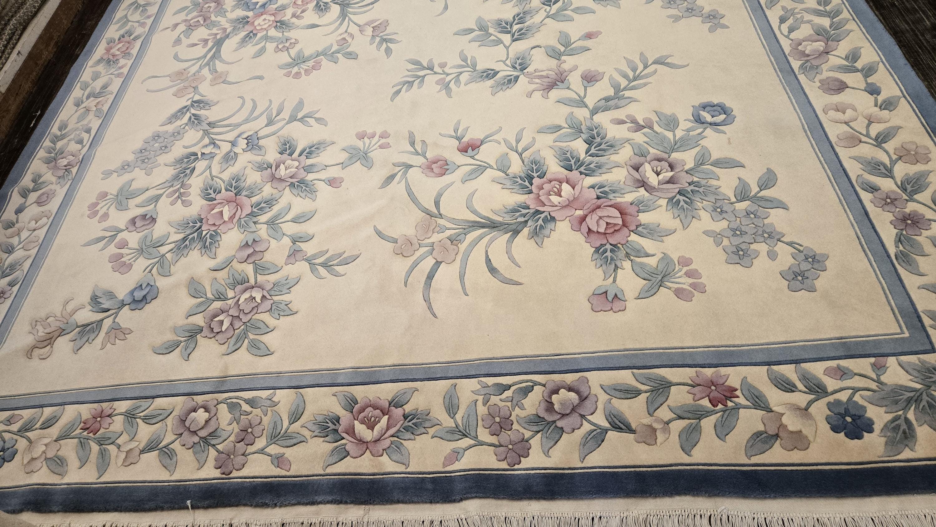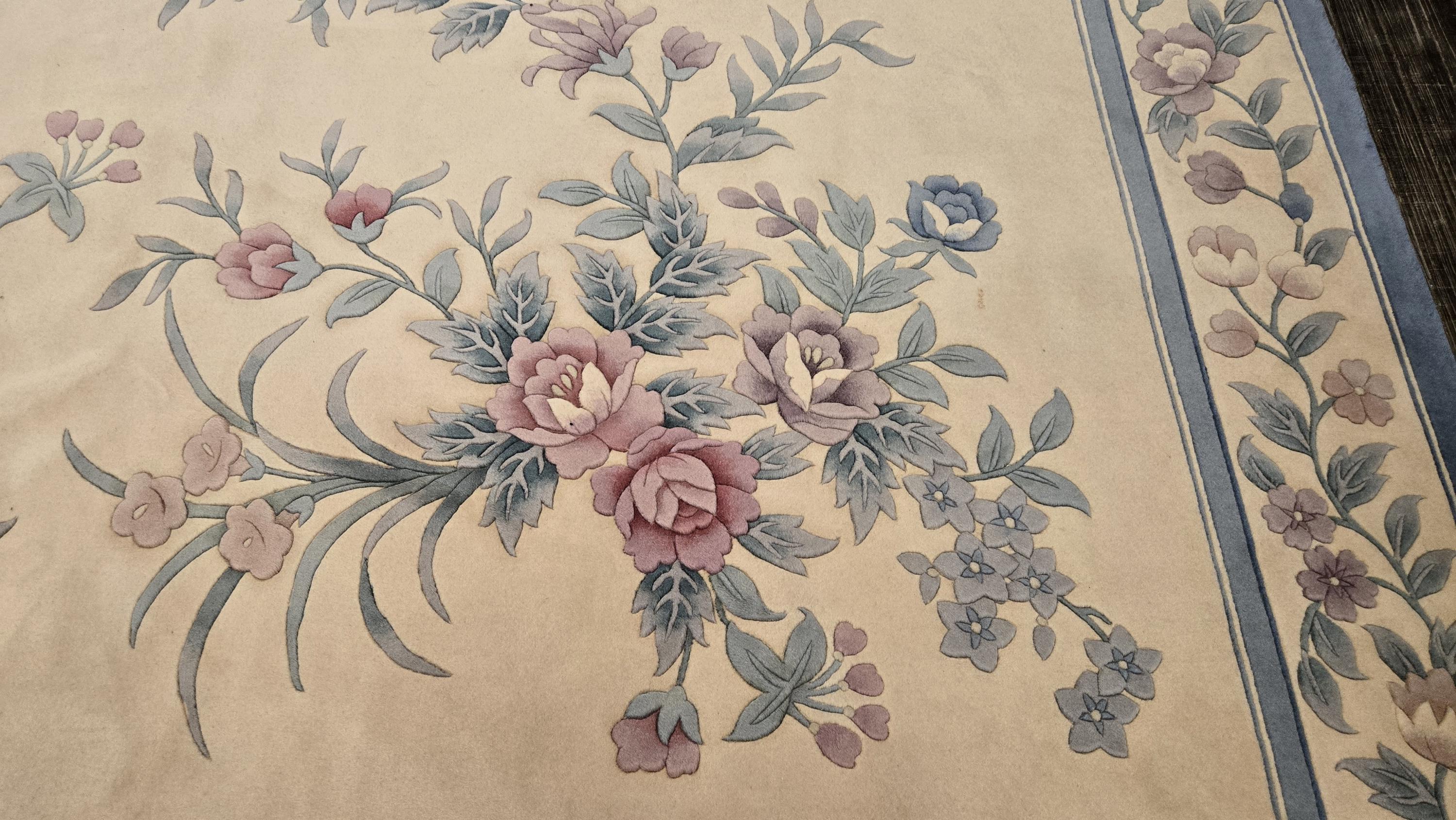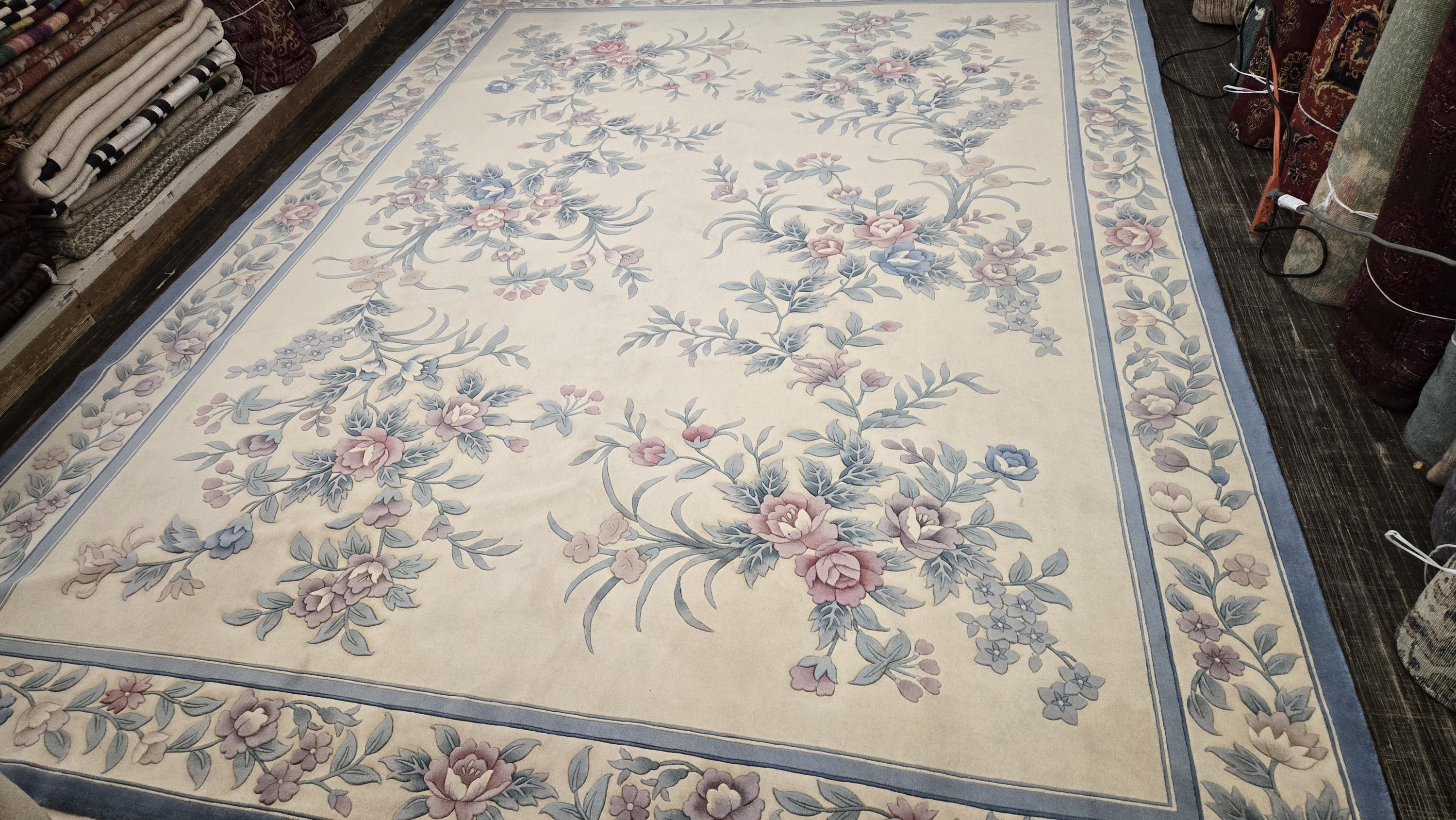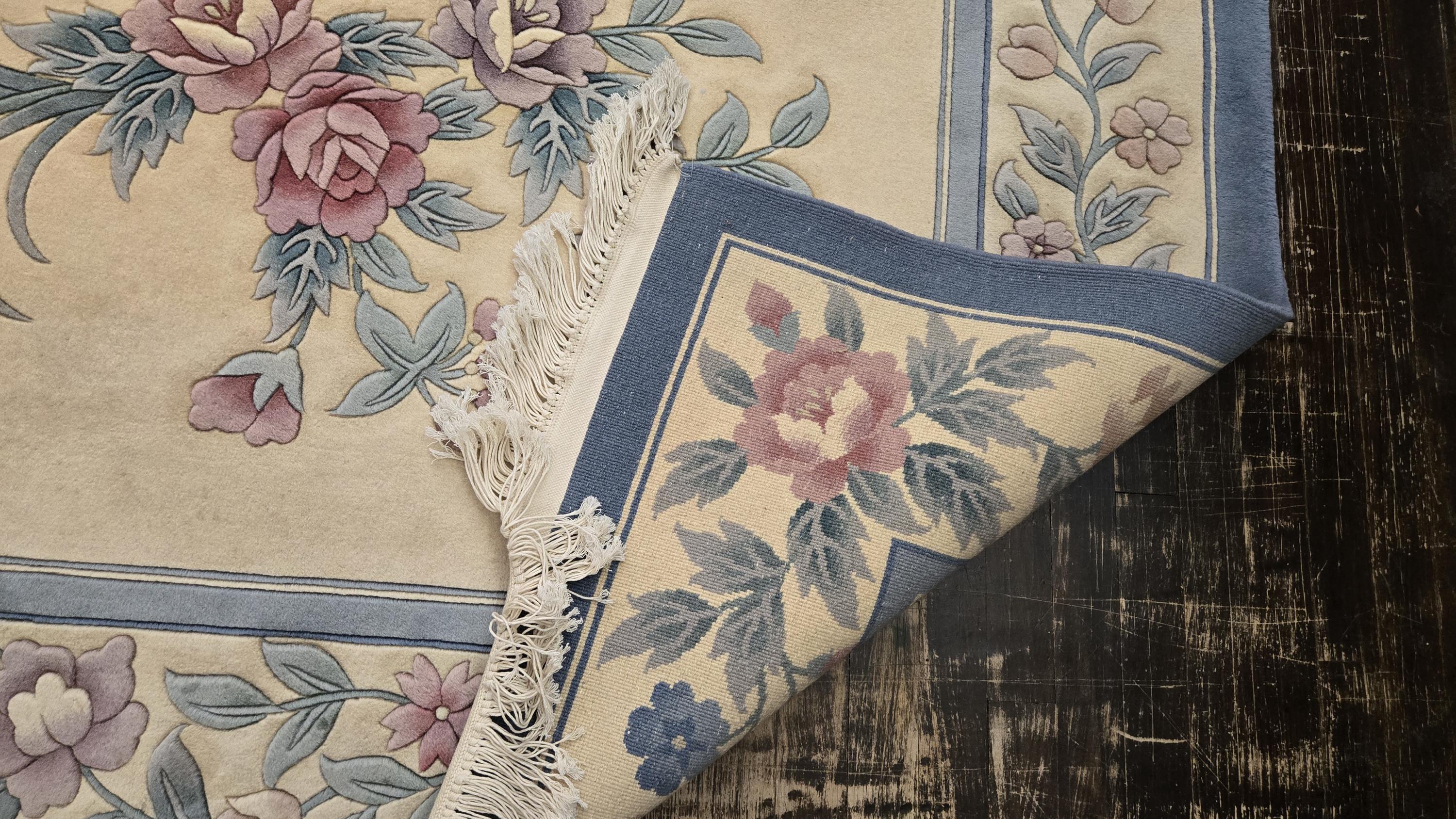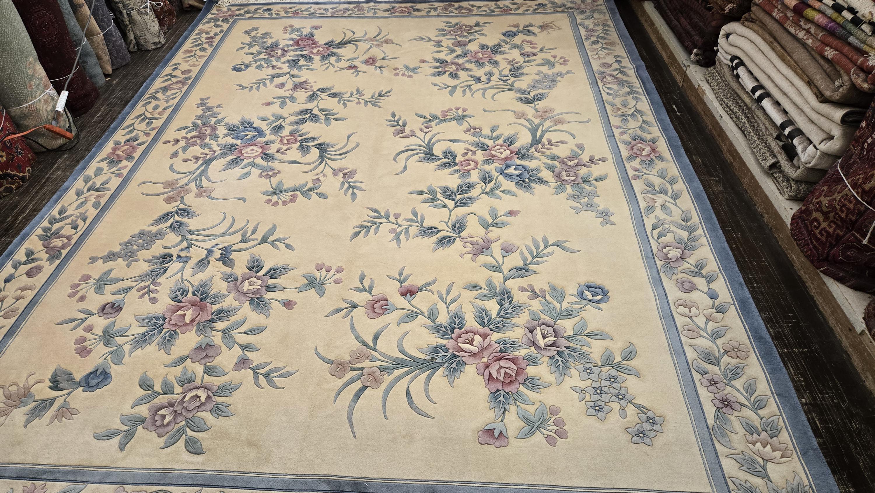 This Chinese rug hand knotted in China with very good quality wool in the 1980's the rugs which were made in the 80s they have much superior quality than the one made later on this rug is in excellent condition size 9'×12' this rug never been used the color in this rug is beige background with blue border this rug is over 100 pounds indication of very high quality wool the wool is very soft