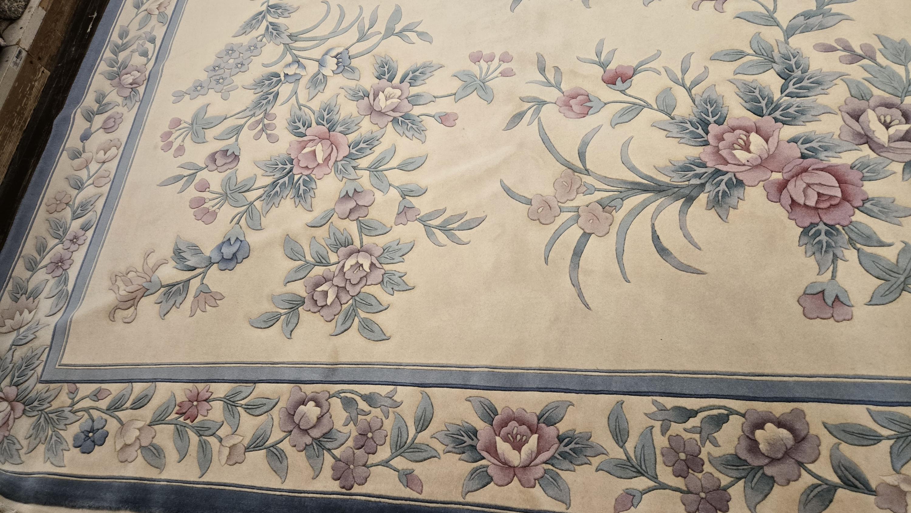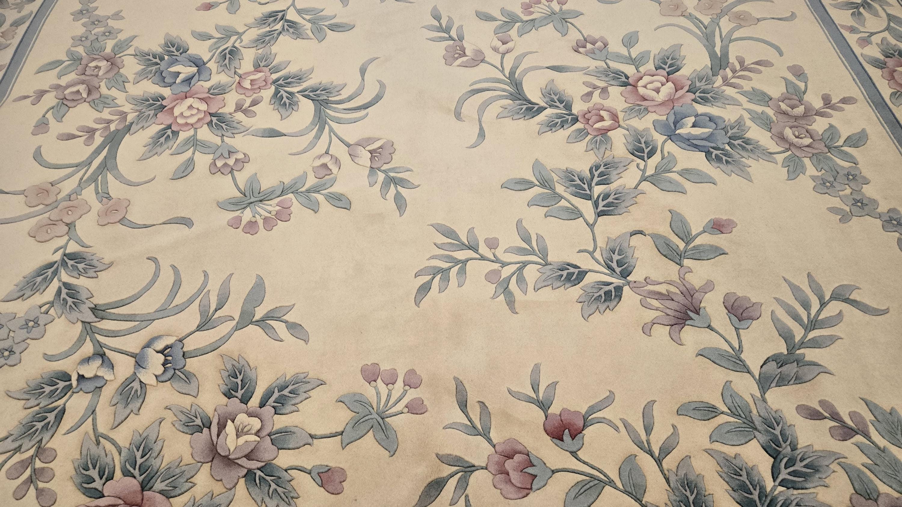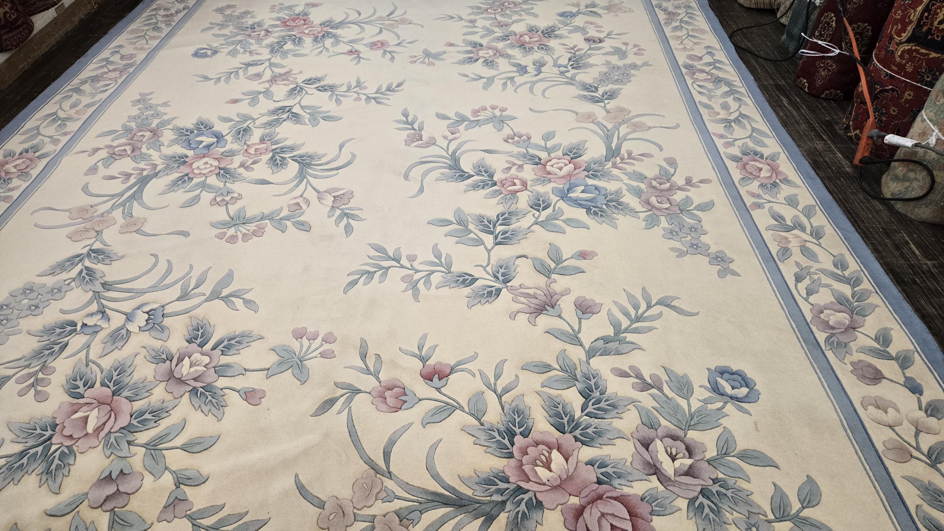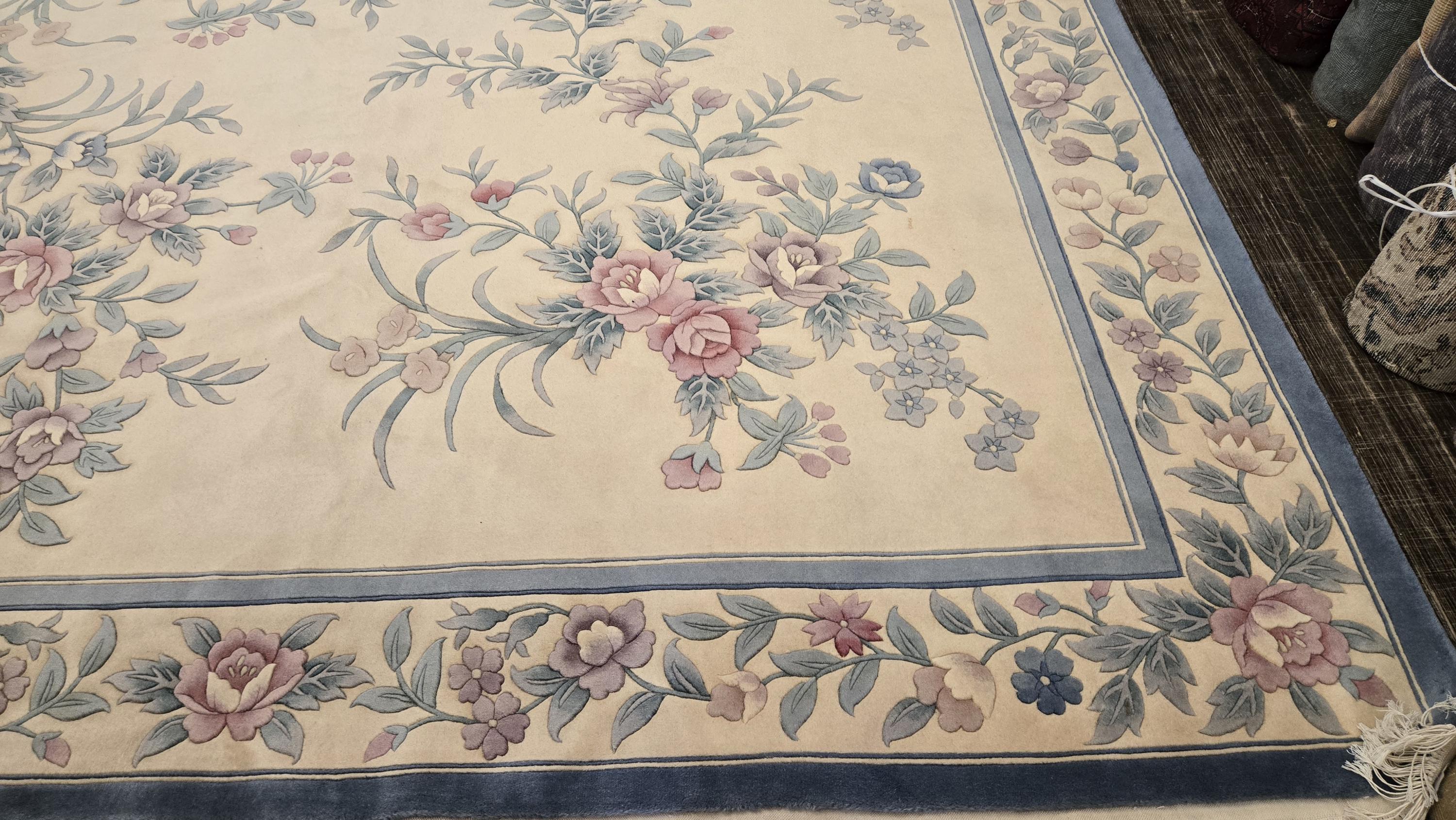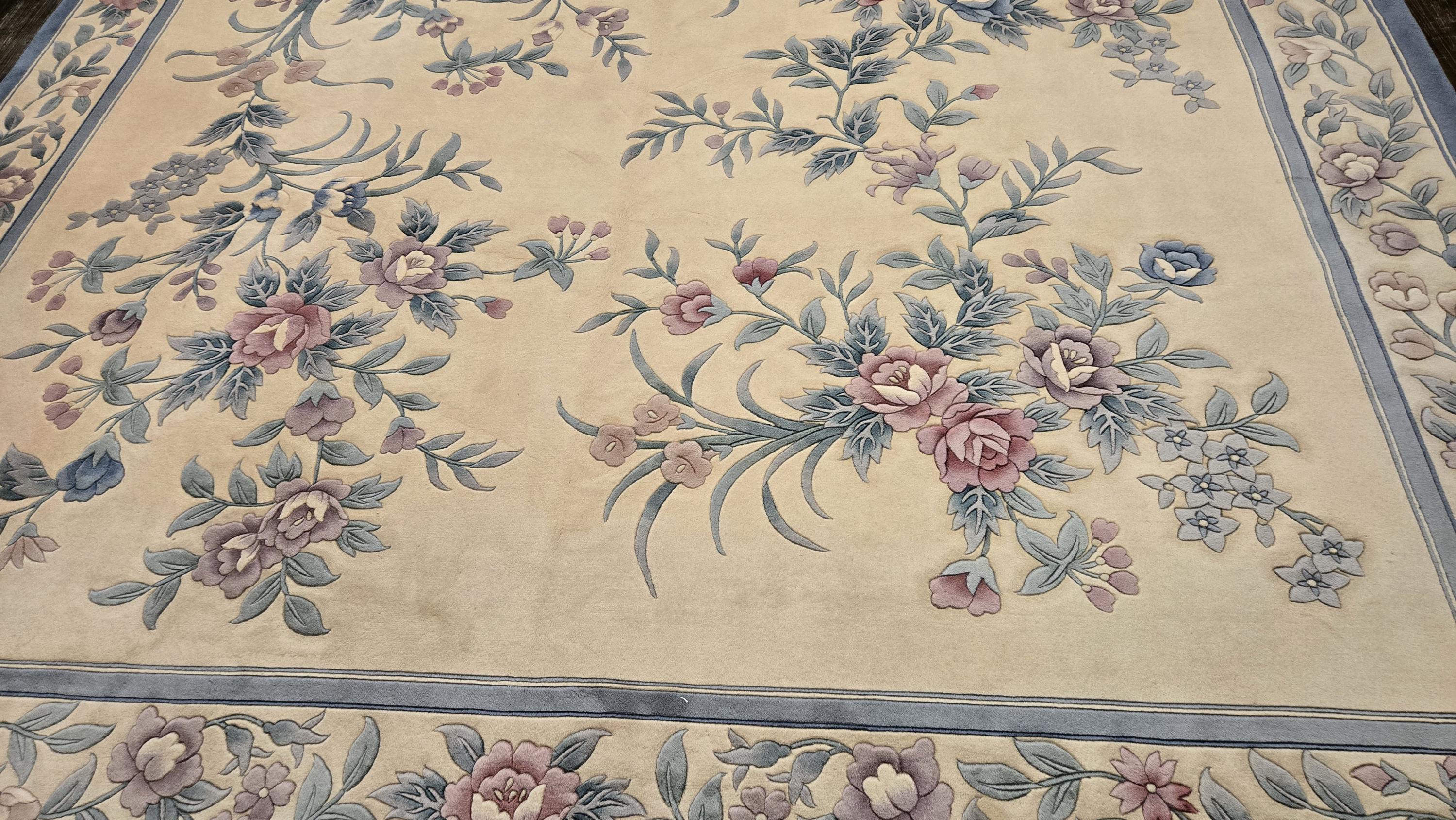 This Chinese rug hand knotted in China with very good quality wool in the 1980's the rugs which were made in the 80s they have much superior quality than the one made later on this rug is in excellent condition size 9'×12' this rug never been used the color in this rug is beige background with blue border this rug is over 100 pounds indication of very high quality wool the wool is very soft