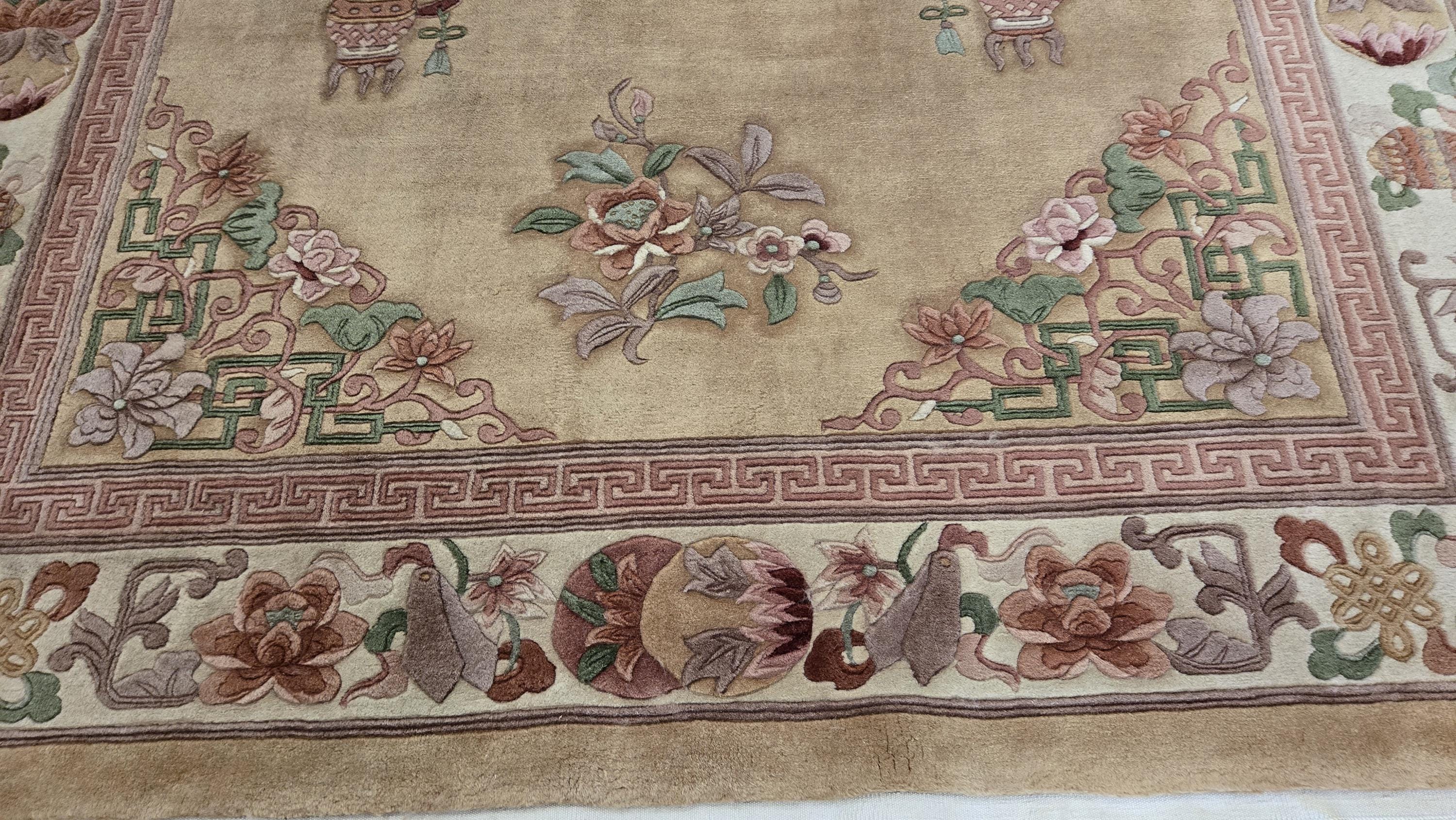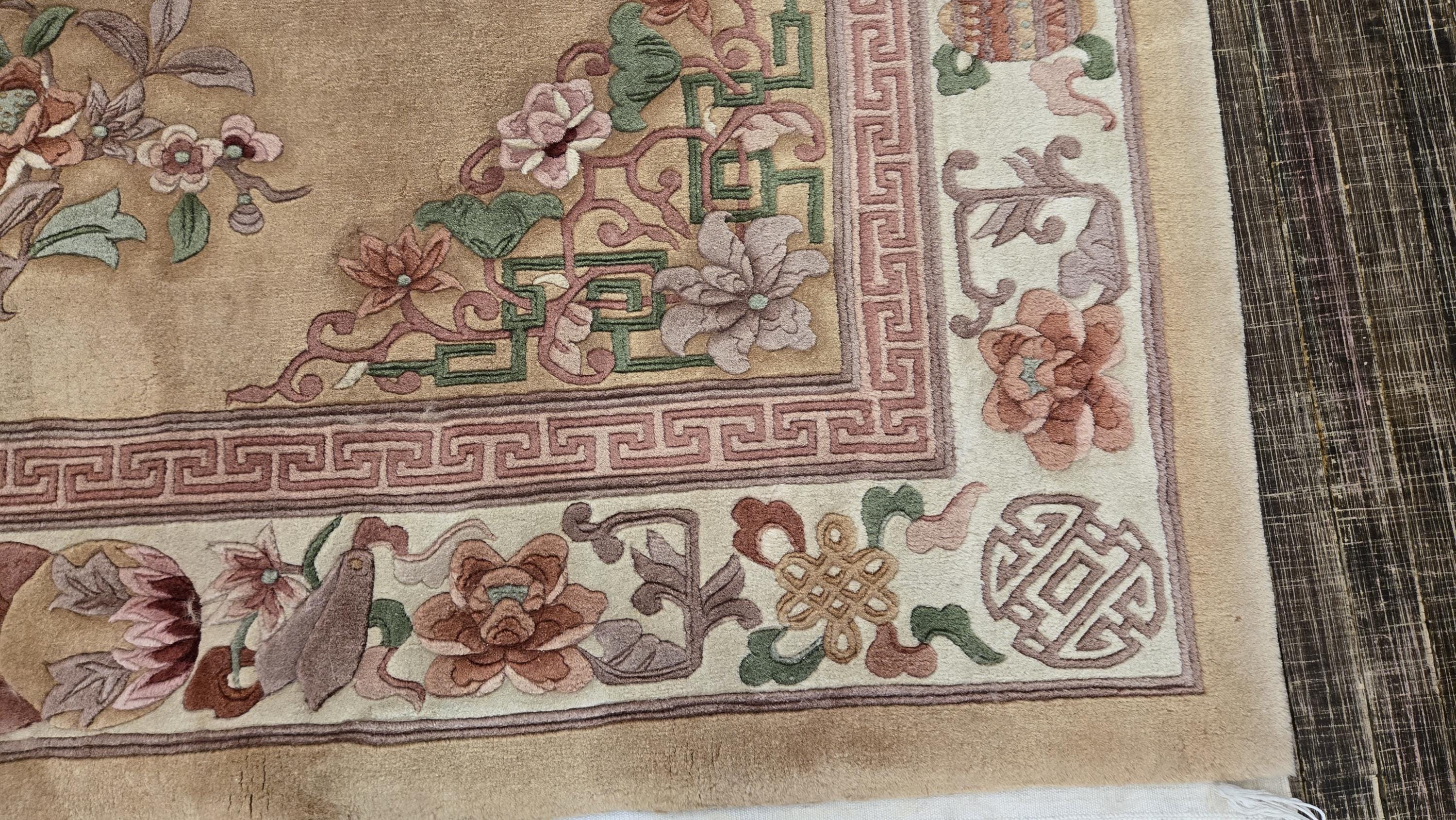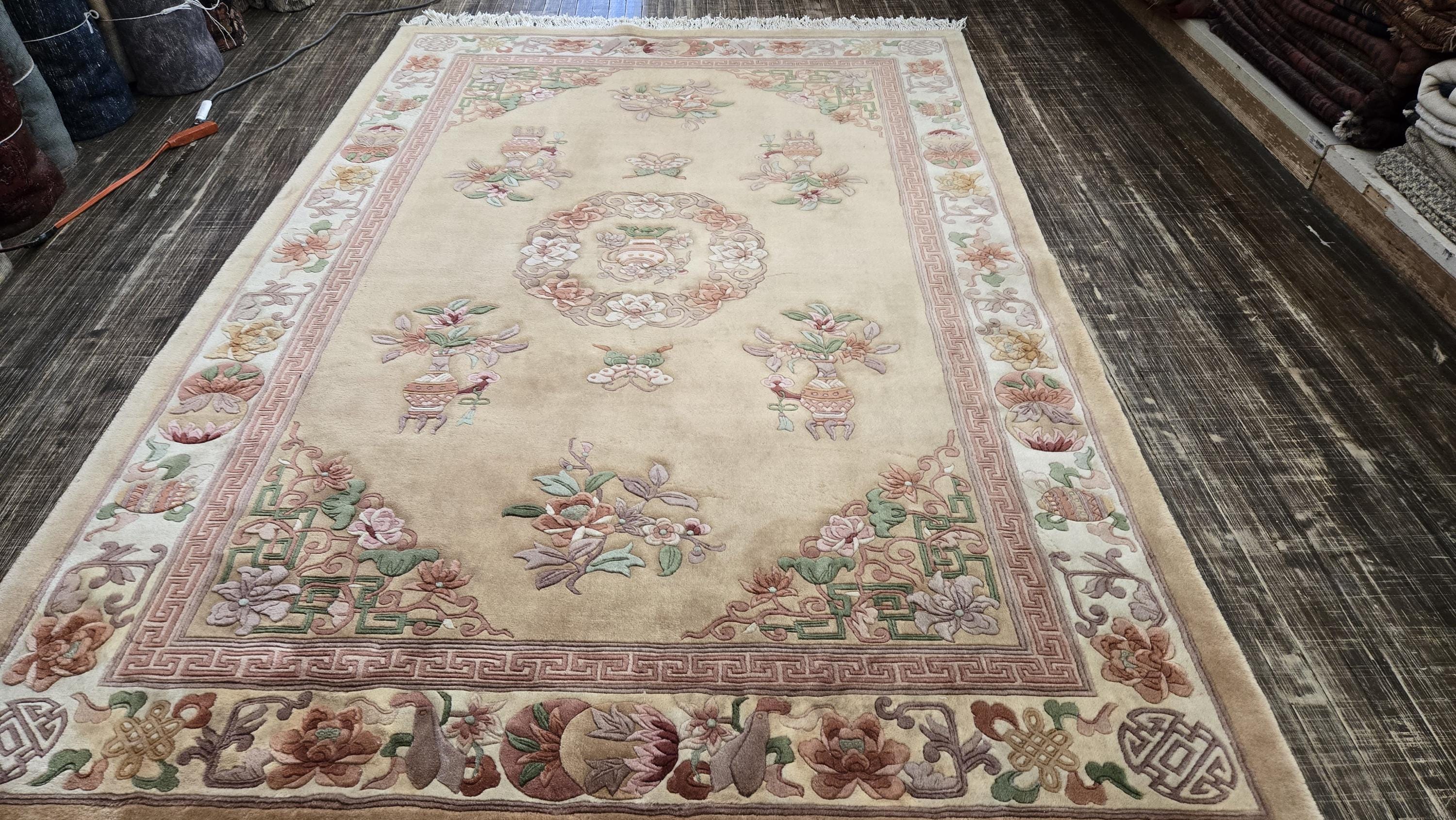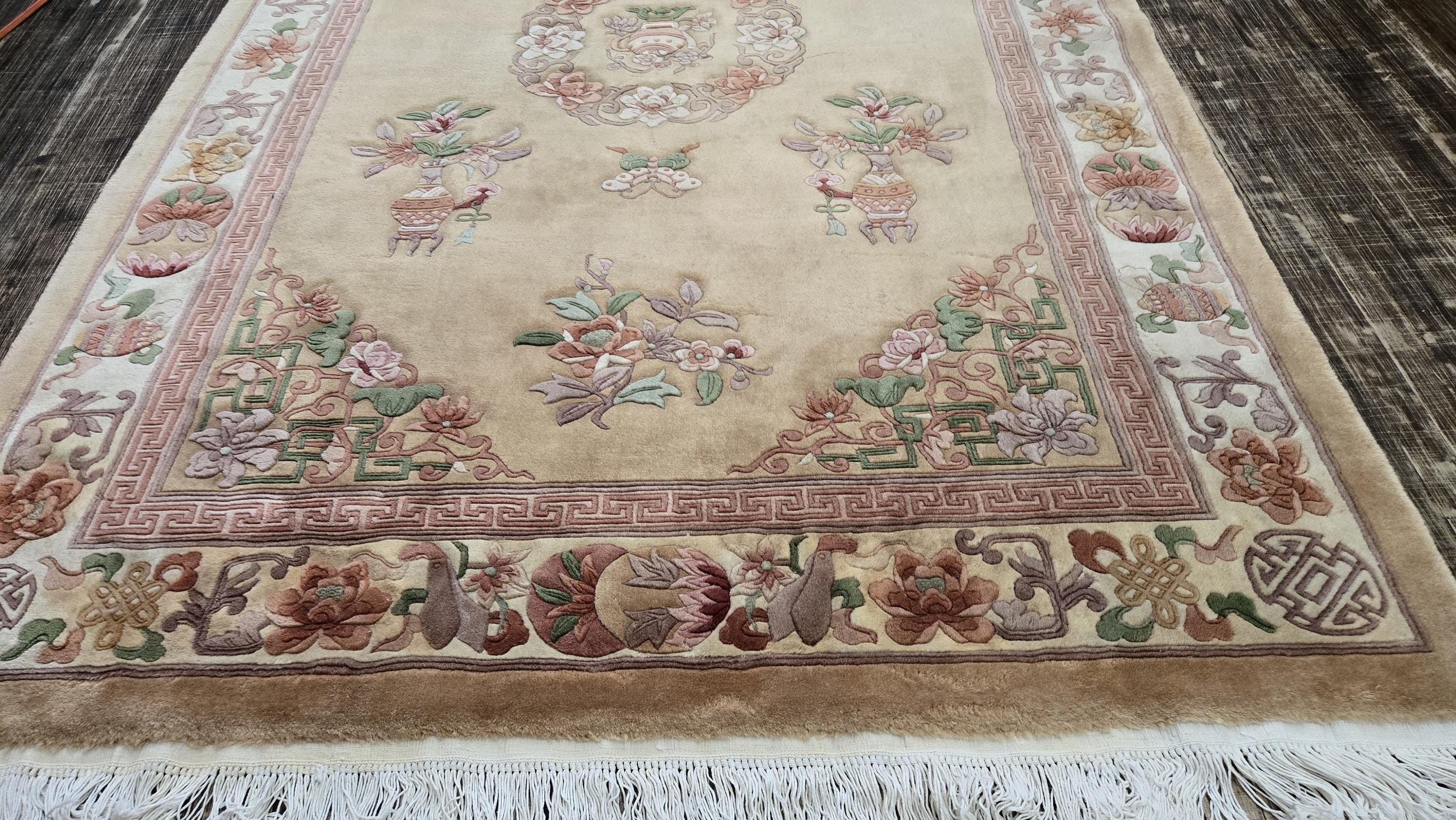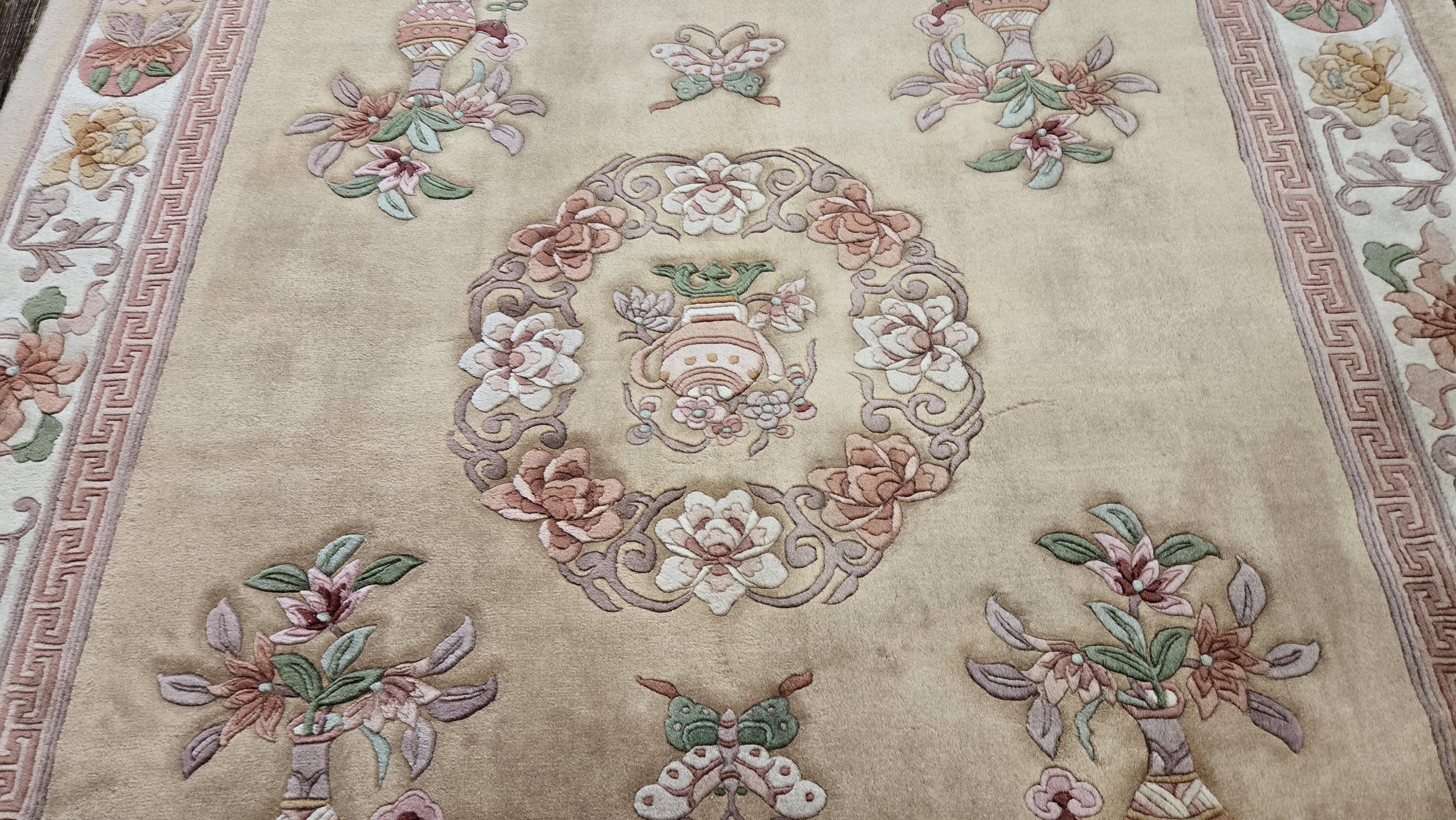This Chinese rug hand knotted in China with very good quality wool in the 1980's the rugs which were made in the 80s they have much superior quality than the one made later on this rug is in excellent condition size 6'×9' this rug is vintage used the color in this rug is gold background with blue green border this rug is over 54 pounds indication of very high quality wool the wool is very soft