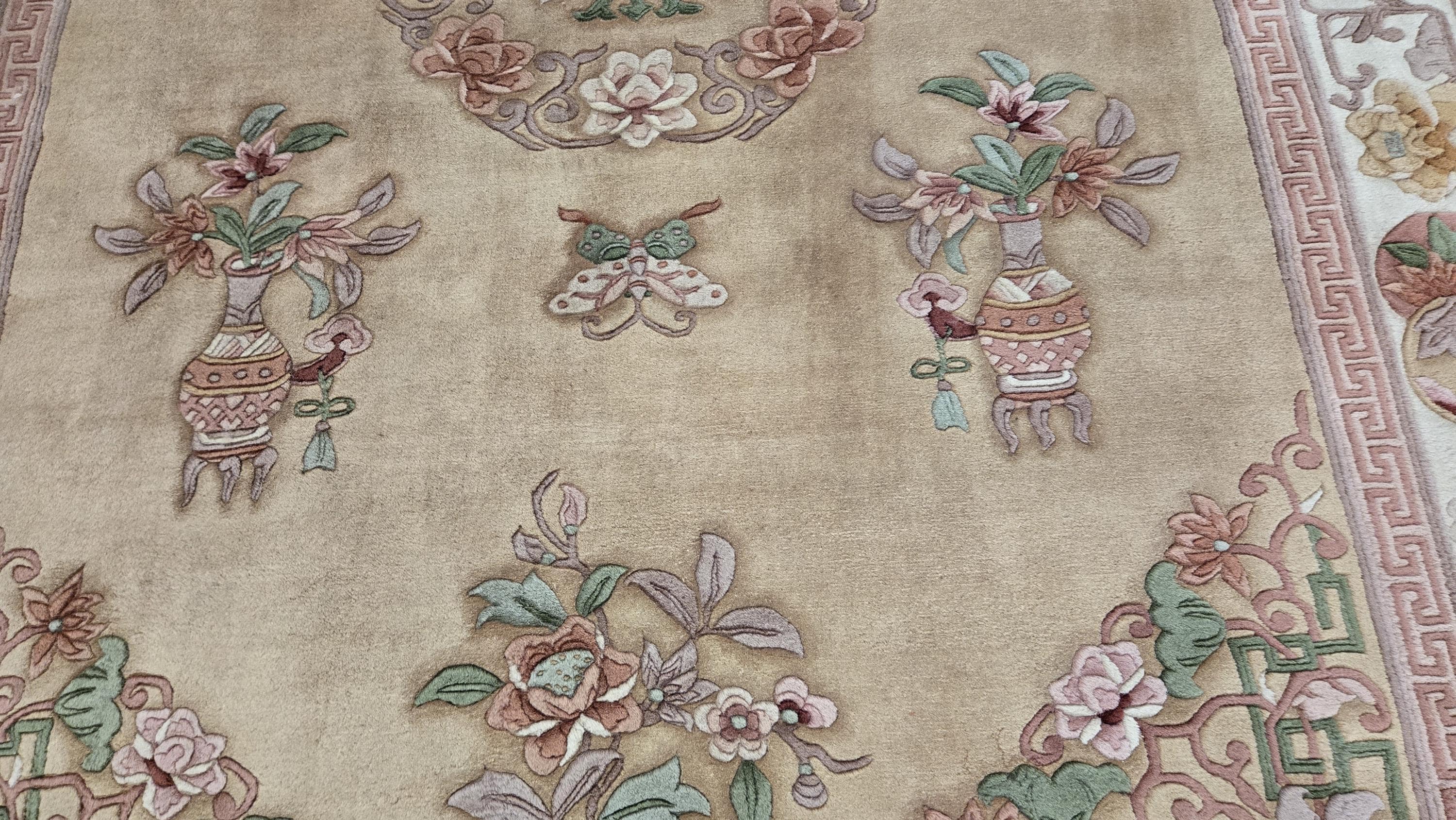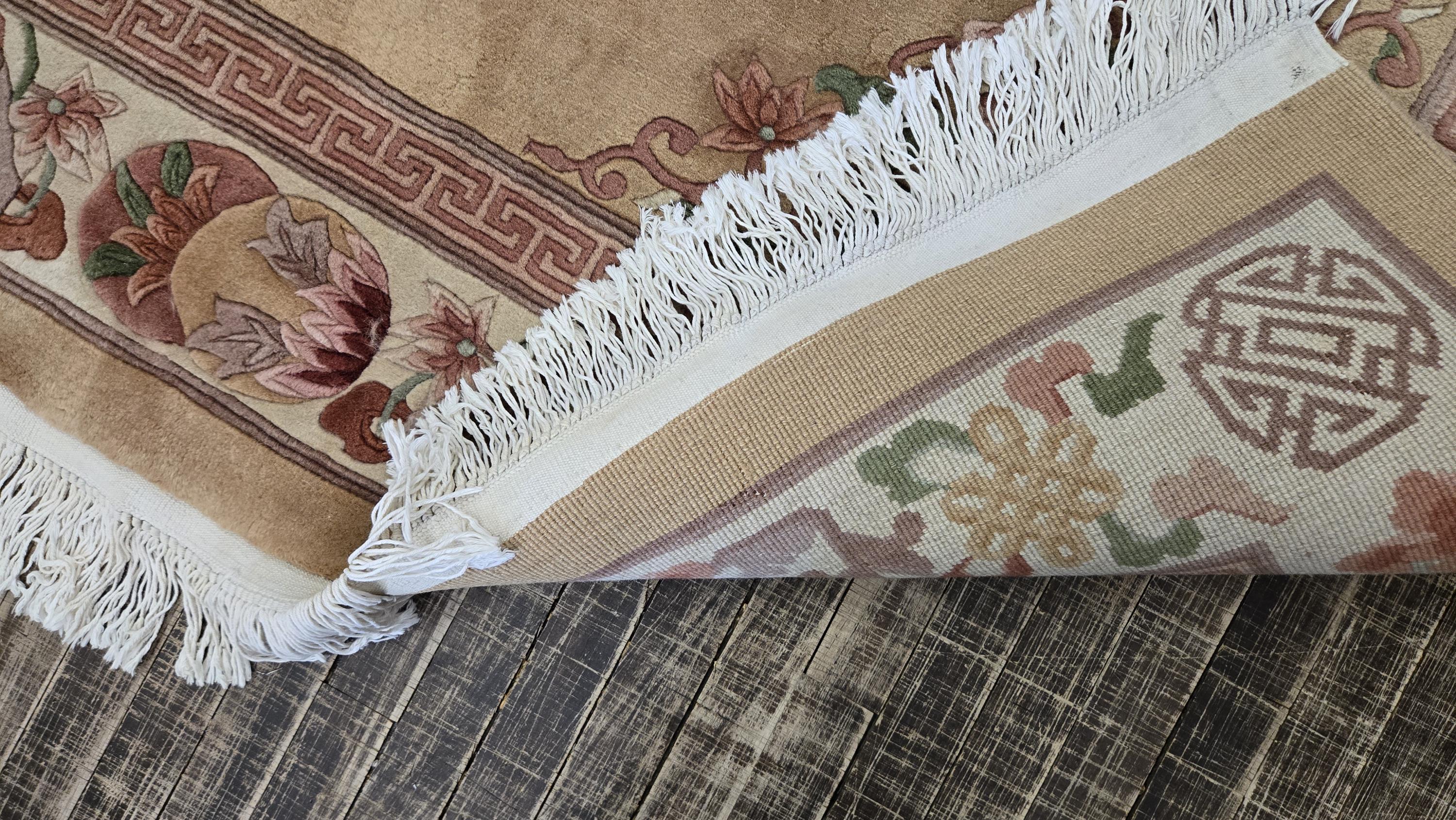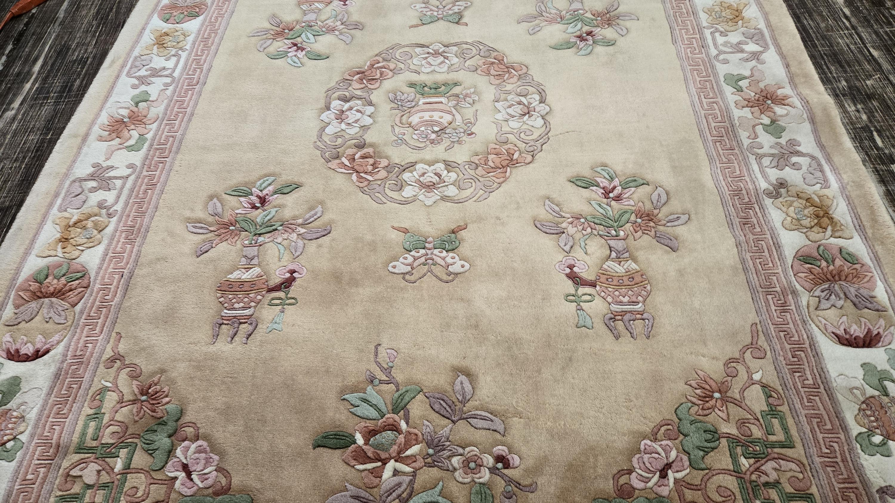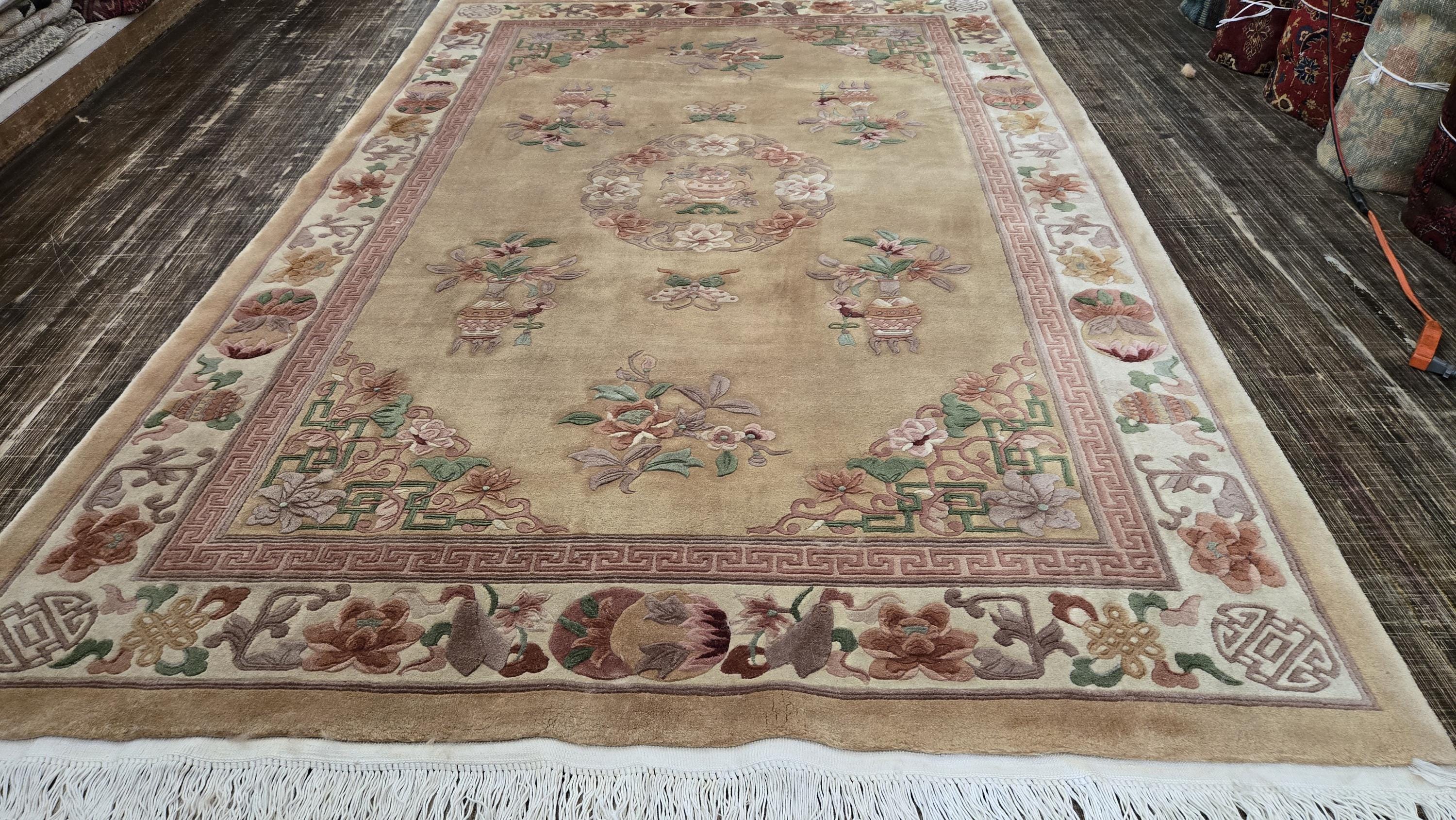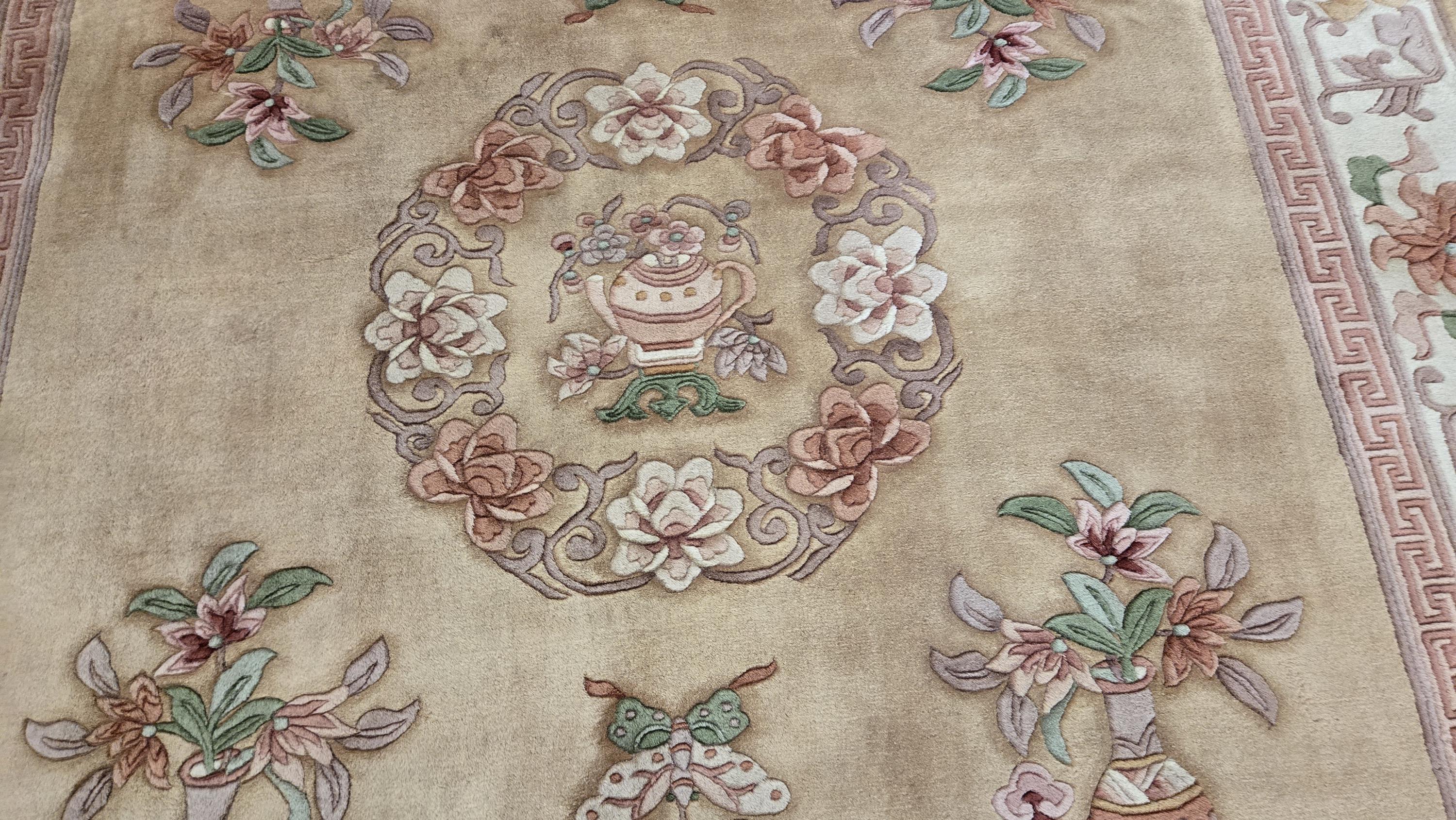 This Chinese rug hand knotted in China with very good quality wool in the 1980's the rugs which were made in the 80s they have much superior quality than the one made later on this rug is in excellent condition size 6'×9' this rug is vintage used the color in this rug is gold background with blue green border this rug is over 54 pounds indication of very high quality wool the wool is very soft