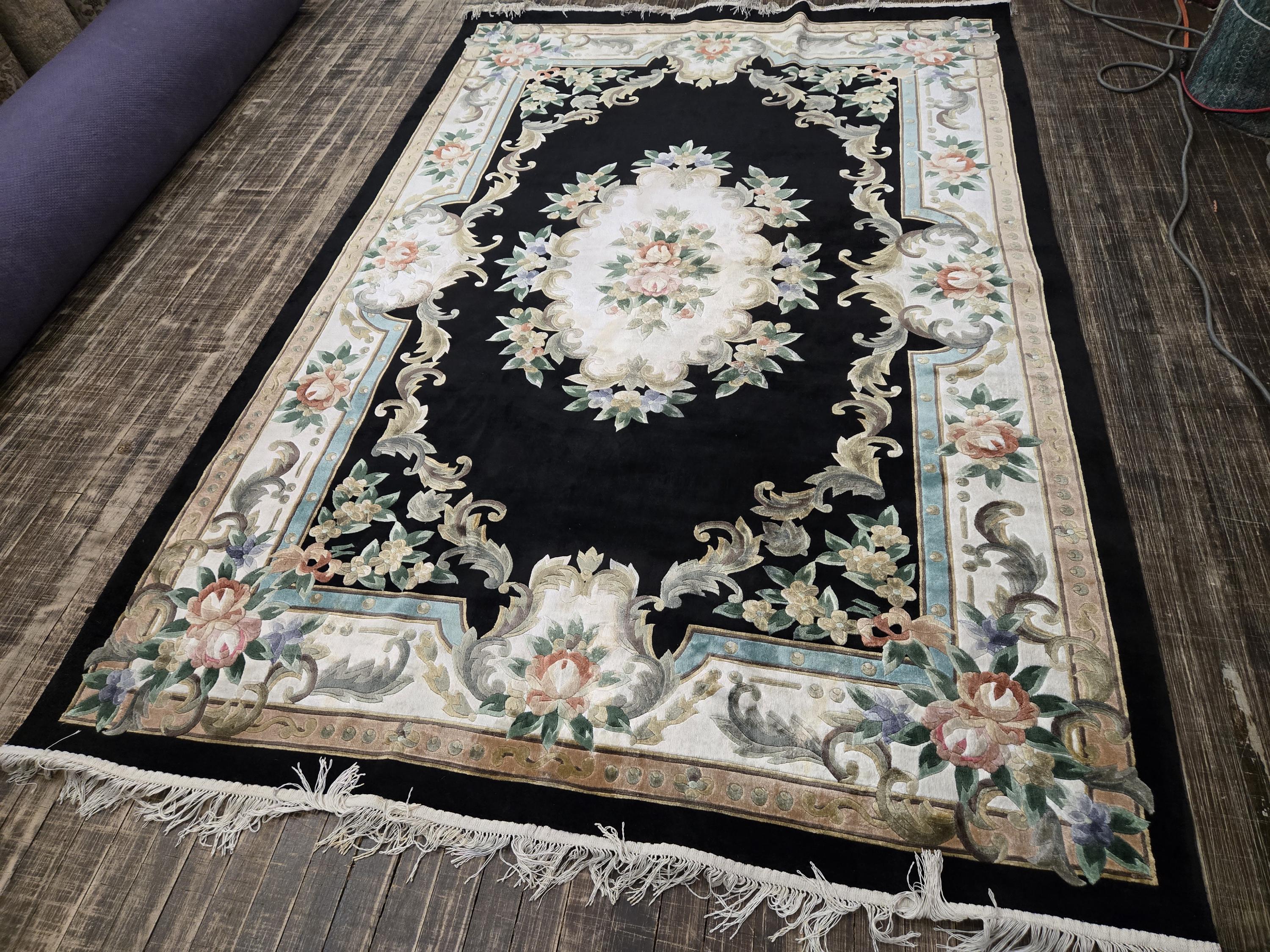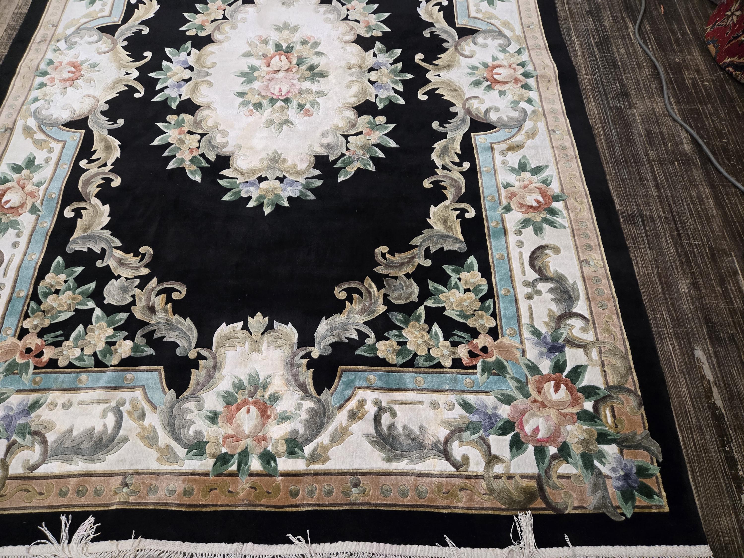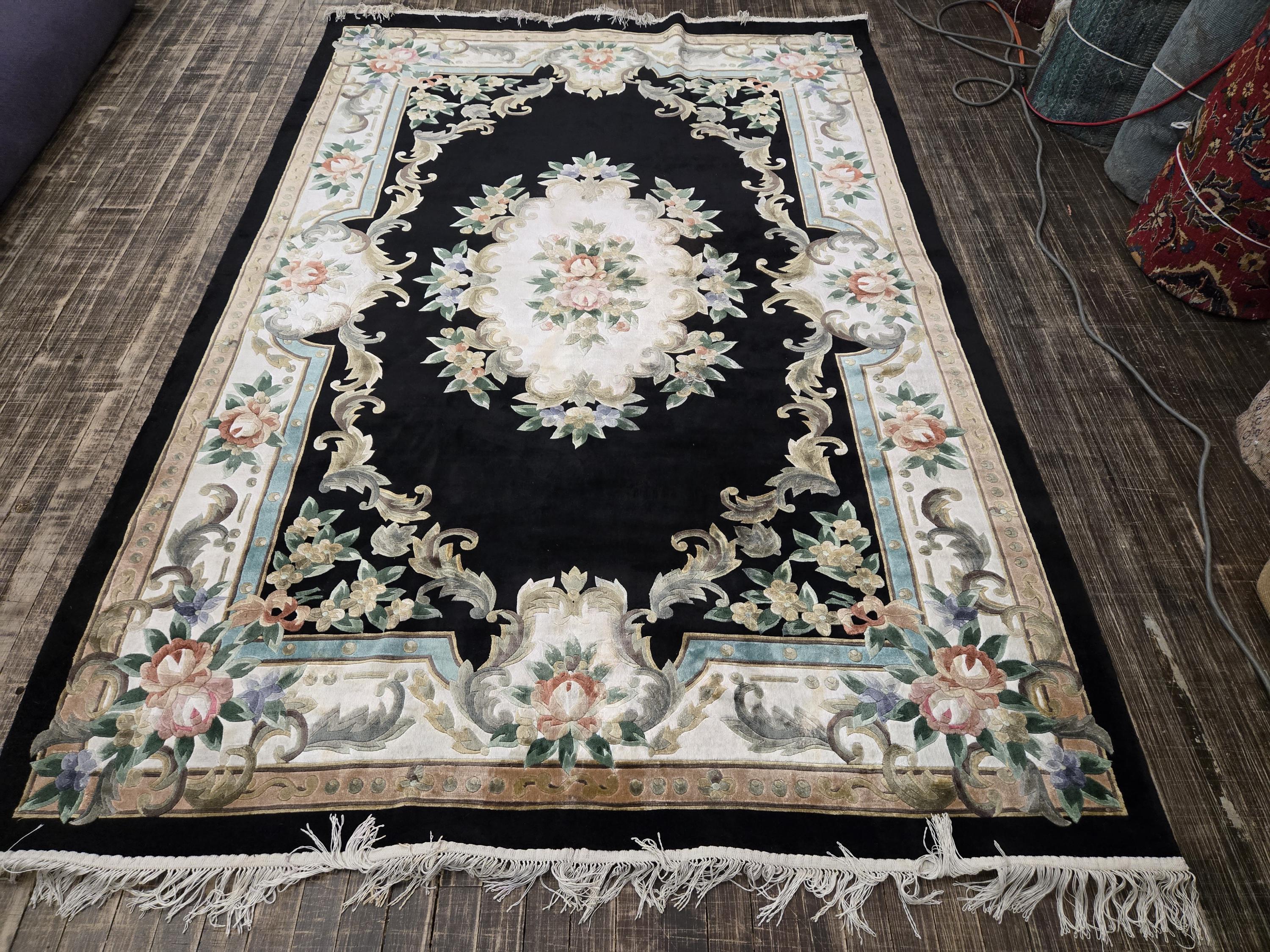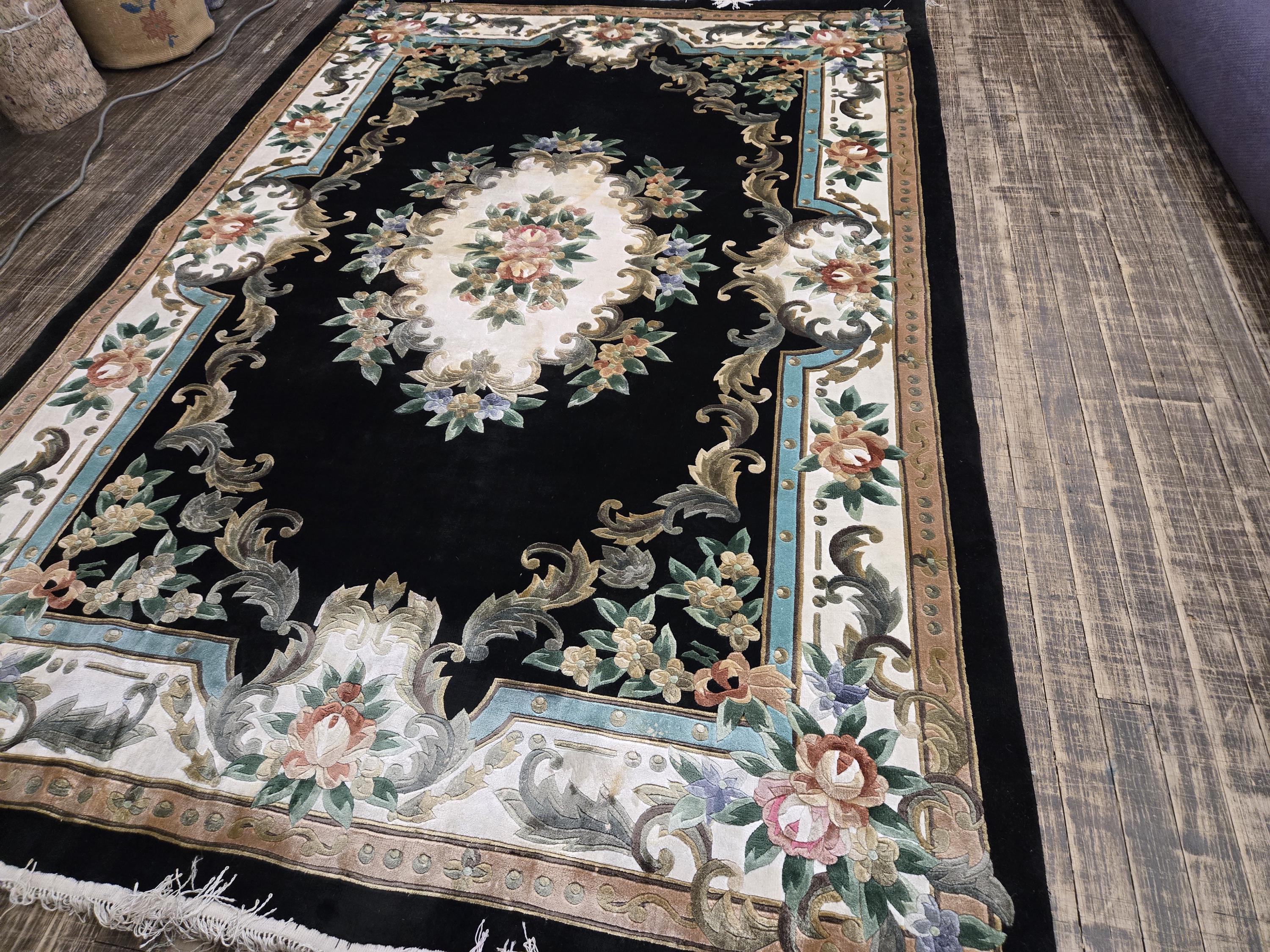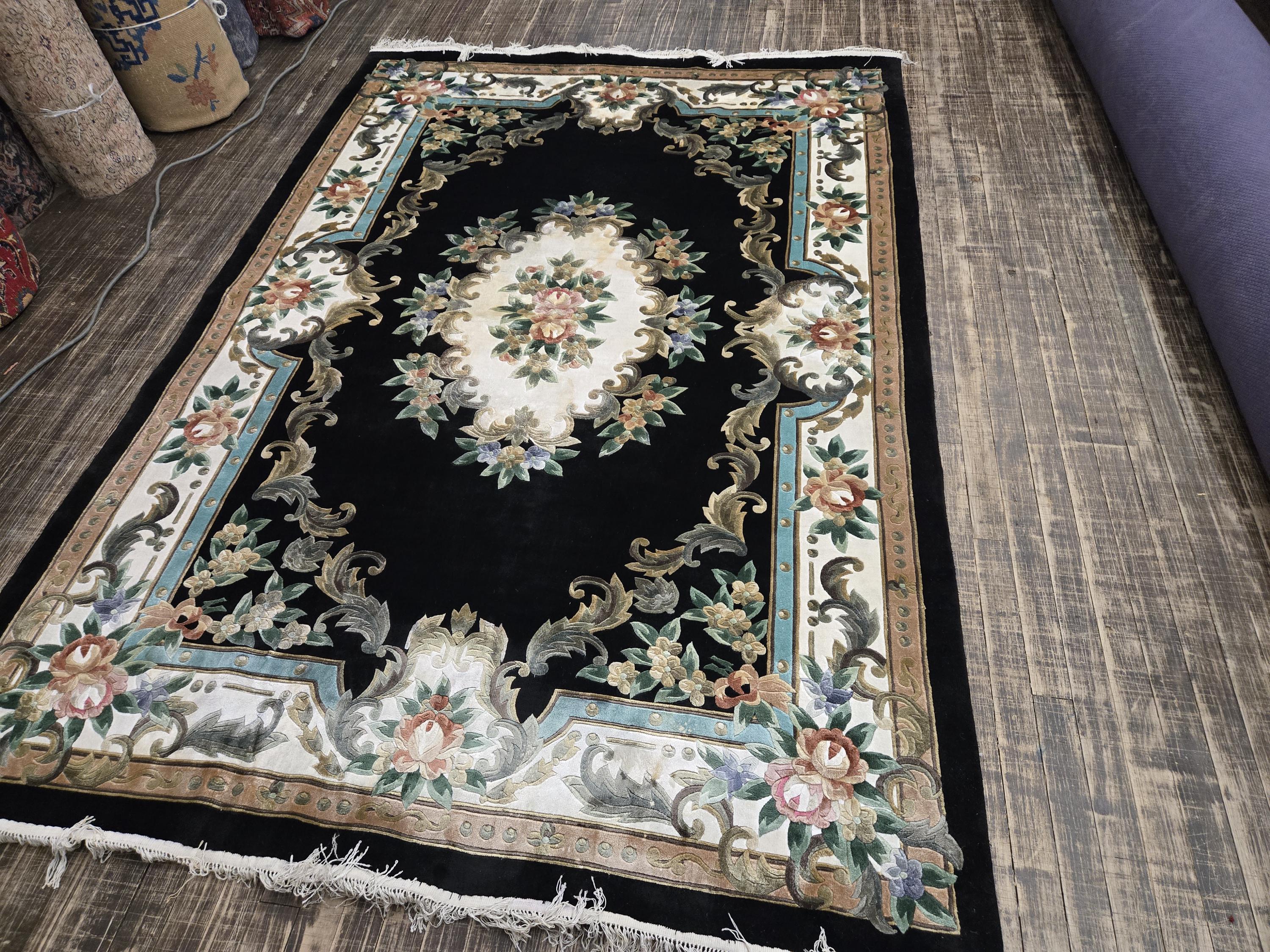 This Chinese rug hand knotted China with Silk pills in the 1980's the rugs which were made in the 80s they have much superior quality than the one made later on this rug is vintage recently cleaned and ready for use size 5'×8' the color in this rug is black background with multi color border art silk