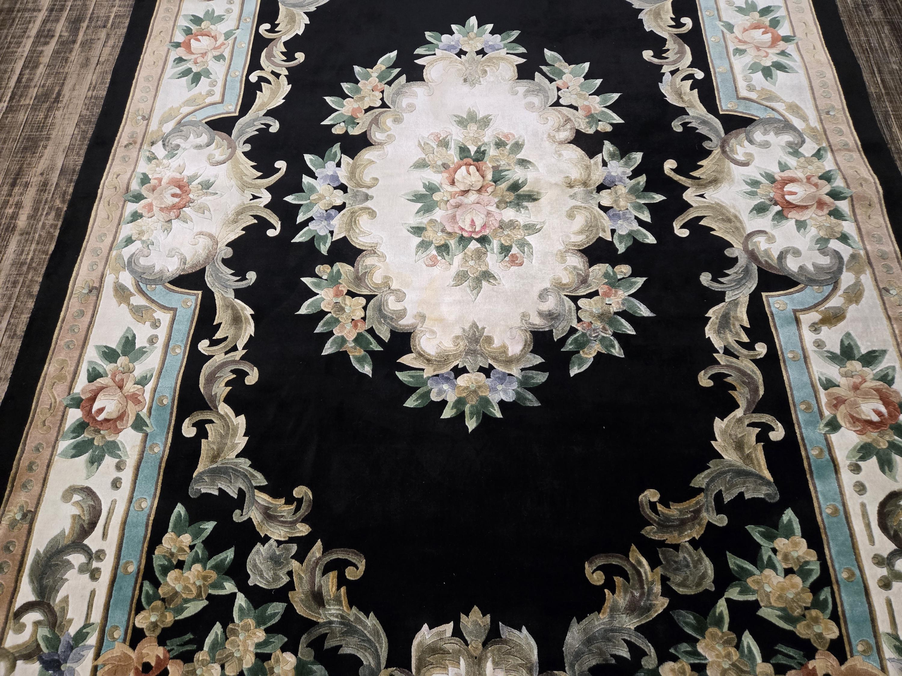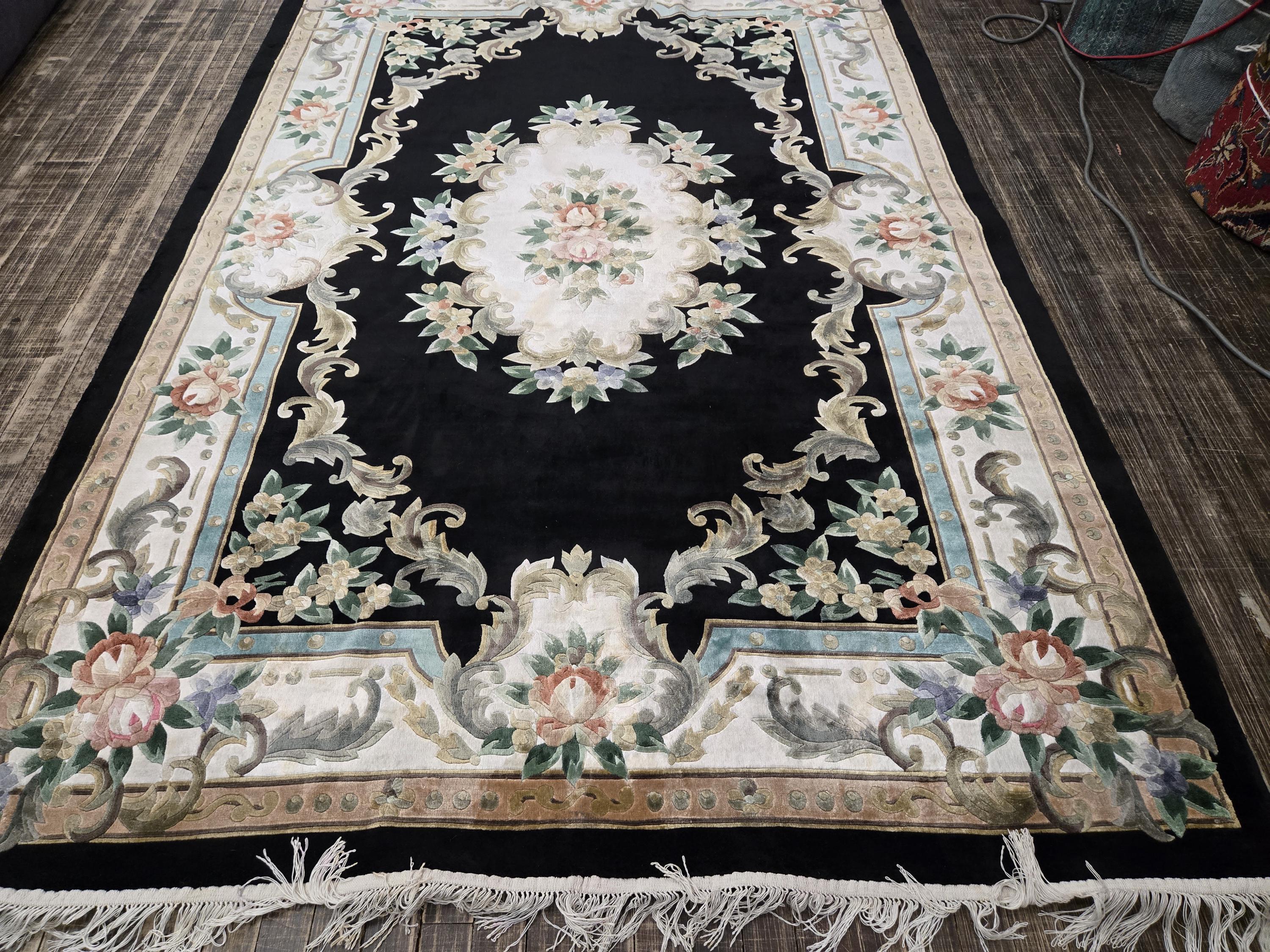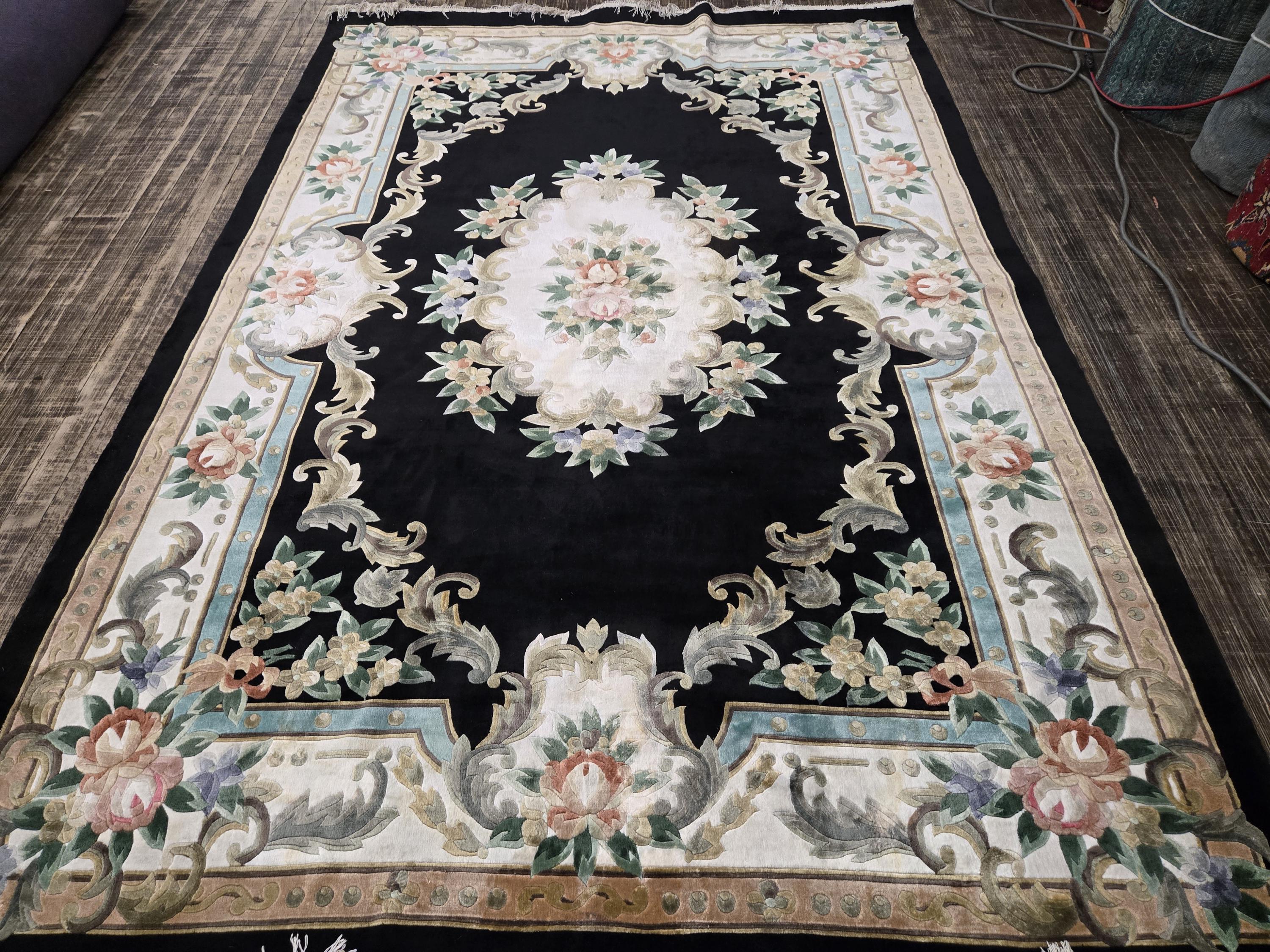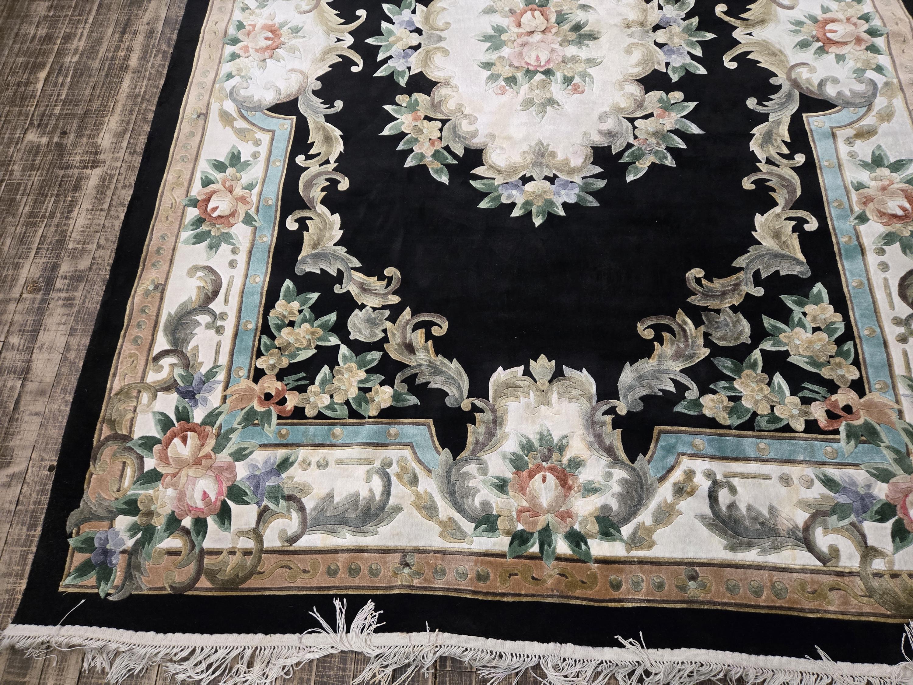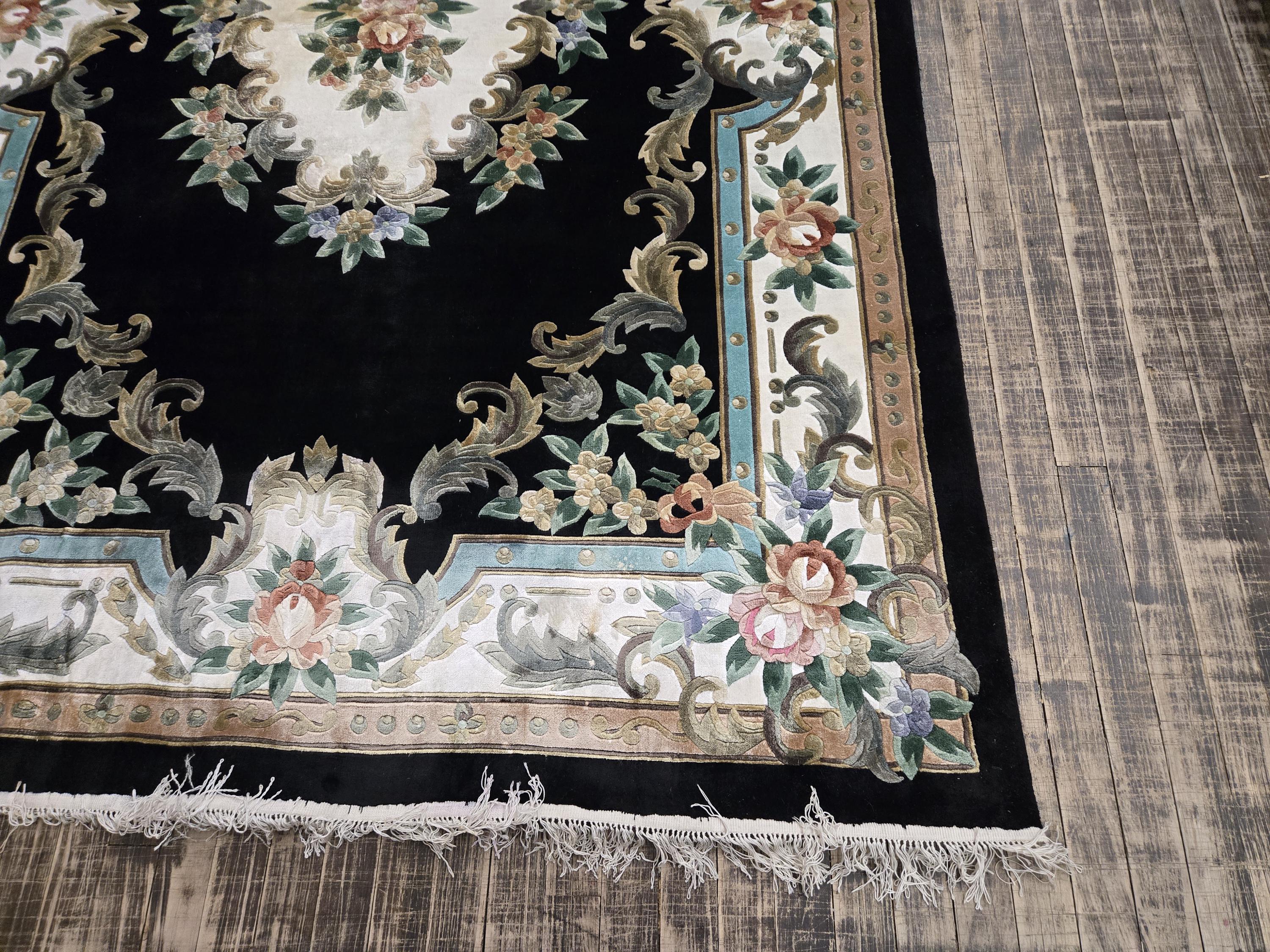 This Chinese rug hand knotted China with Silk pills in the 1980's the rugs which were made in the 80s they have much superior quality than the one made later on this rug is vintage recently cleaned and ready for use size 5'×8' the color in this rug is black background with multi color border art silk
